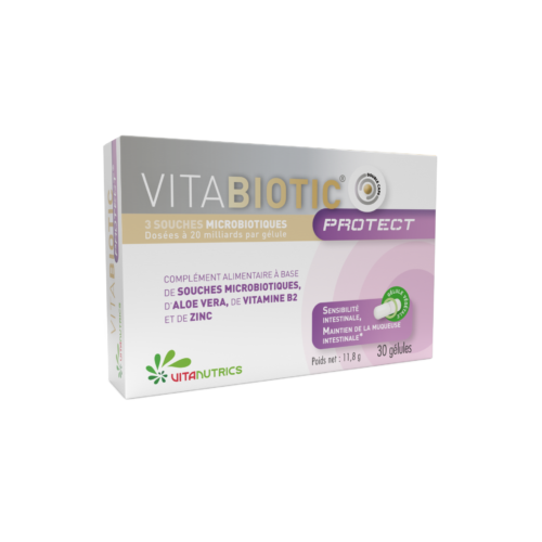 Notre formule complète est enrichie en souches microbiotiques, Aloe vera, zinc et vitamines du groupe B2. Le zinc contribue à protéger les cellules du stress oxydatif, la vitamine B2 contribue au maintien normal des muqueuses telle que celle de l’intestin. Cette association unique permet d’assurer le bon fonctionnement de la muqueuse intestinale.
