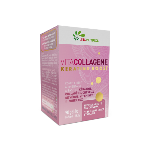 La formule de VITACOLLAGENE KERATINE BOOST est hautement dosée et combine de la kératine, du collagène, un extrait de cheveux de Vénus, des nutriments et des antioxydants. Les différents ingrédients sélectionnés sont clé pour booster le rééquilibre des facteurs qui causent la chute des cheveux.